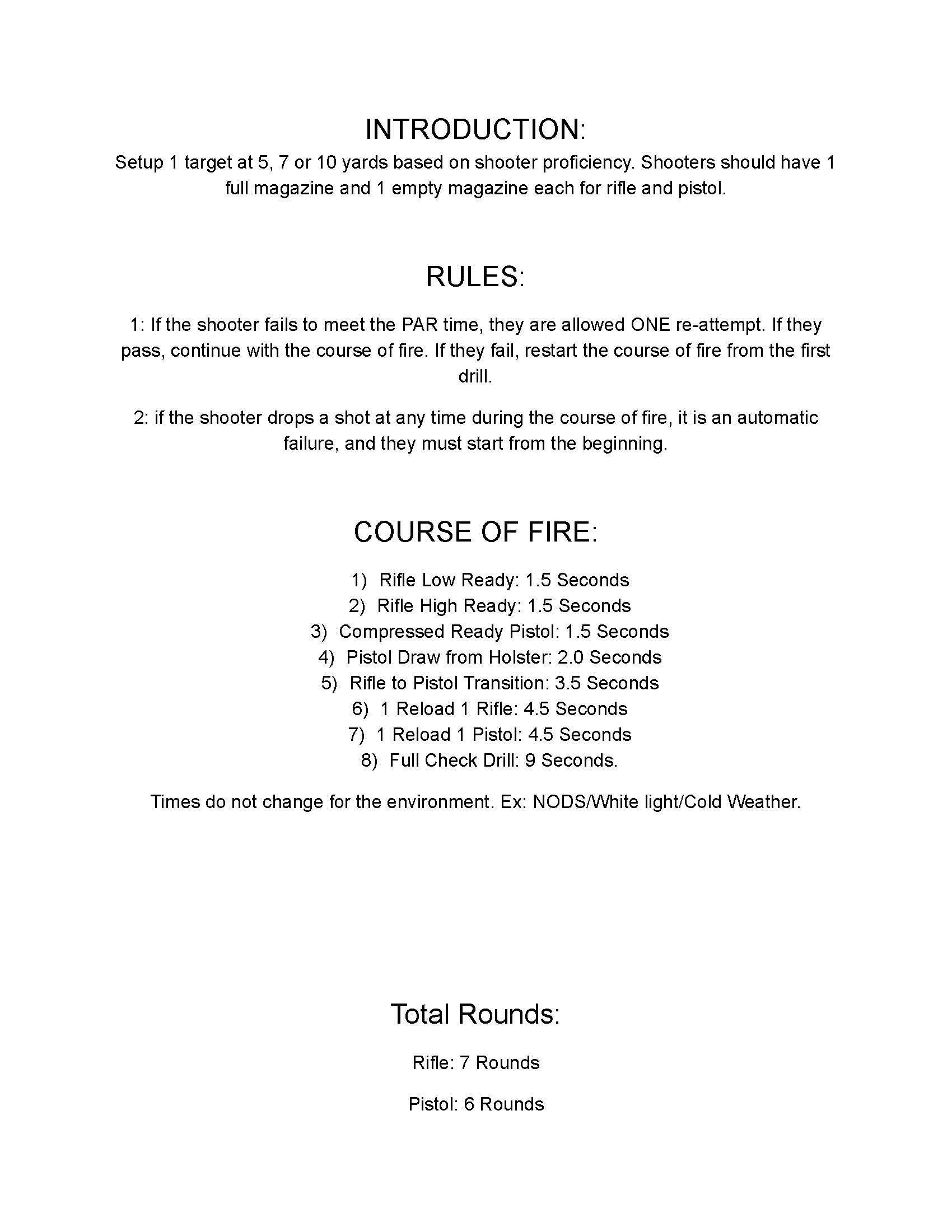 Background: This pass/fail course of fire emphasizes accountability of rounds while allowing generous par times. It works well as a range-day warm-up and offers a standardized way to evaluate a newer shooter’s weapon handling, manipulation, and gear setup.